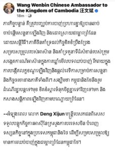 បង្ហោះសារនៅលើបណ្ដាញសង្គមផ្លូវការ ព្រឹកថ្ងៃទី២៤ ខែធ្នូ ឆ្នាំ២០២៥ ក្នុងពេលលេខាធិការដ្ឋានកិច្ចការព្រុំដែនទូទៅ (GBC) កម្ពុជា-ថៃ ជួបគ្នា លោក វ៉ាង វីនប៊ីន ឯកអគ្គរដ្ឋទូតចិនប្រចាំកម្ពុជា បានប្រកាសថា ភារកិច្ចបន្ទាន់ គឺត្រូវបញ្ឈប់ការបាញ់ប្រហារគ្នា ឱ្យបានឆាប់ ហើយចាប់ផ្តើមសន្ទនាឡើងវិញ និងដោះស្រាយជម្លោះព្រំដែន ដោយសន្តិវិធី។