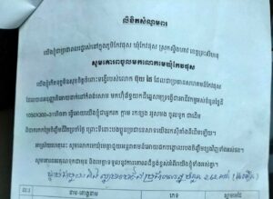 ខេត្តព្រះសីហនុ ៖ ប្រជាពលរដ្ឋជាង ២៦០នាក់ រស់នៅភូមិកែវផុស នាំគ្នាផ្តិតស្នាមមេដៃ ដាក់លិខិតជូន លោកមេឃុំកែវផុស ស្នើឲ្យជួយទប់ស្កាត់សកម្មភាពឈ្មួញមកពីខាងក្រៅ ចុះមកបោះបង្គោលរបង ហ៊ុំព័ទ្ធដីឆ្នេរសមុទ្រតំបន់កែវផុស ធ្វើអាជីវកម្មចិញ្ចឹមខ្យង នាំឲ្យប៉ះពាល់ដល់ការធ្វើរបរនេសាទ ដើម្បីរកប្រាក់ចំណូលចិញ្ចឹមគ្រួសារ របស់ពួកគាត់។